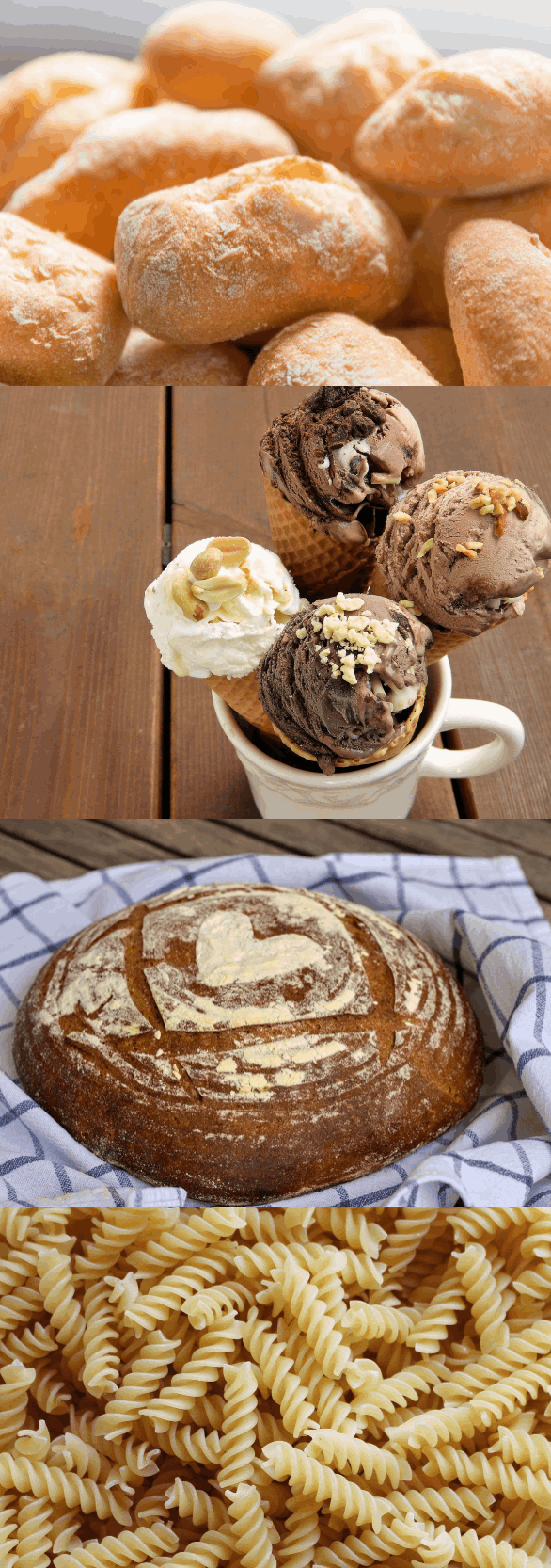 Glutenhaltig sind auch auf Basis dieser Getreidesorten hergestellte Lebensmittel wie Mehl, Nudeln, Gries, Gebäck, Waffeln, Malz, Bier, panierte Lebensmittel, sehr oft verdickte Soßen aber auch viele andere.